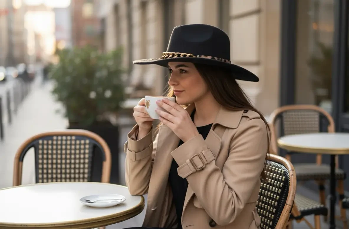 El sombrero «Aurora» evoca la belleza del amanecer, con tonos que recuerdan los primeros rayos de sol. Un accesorio que sugiere misterio y encanto, perfecto para quienes buscan capturar la esencia de un nuevo comienzo en su estilo.