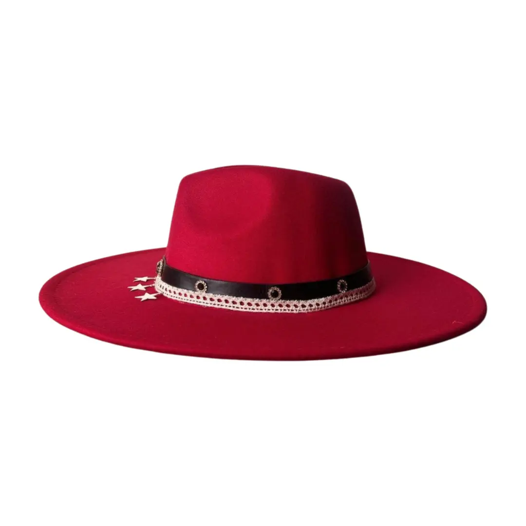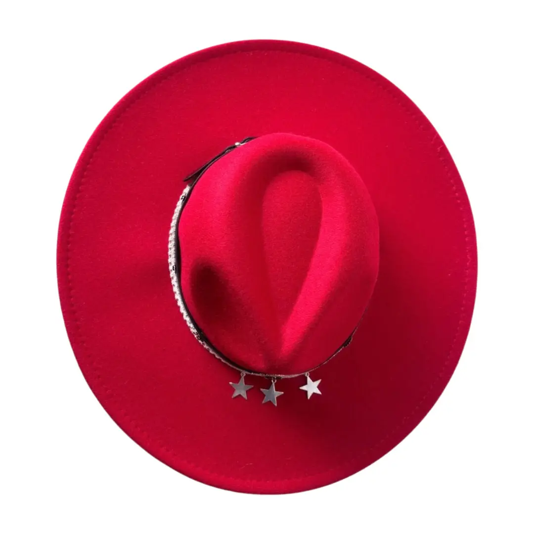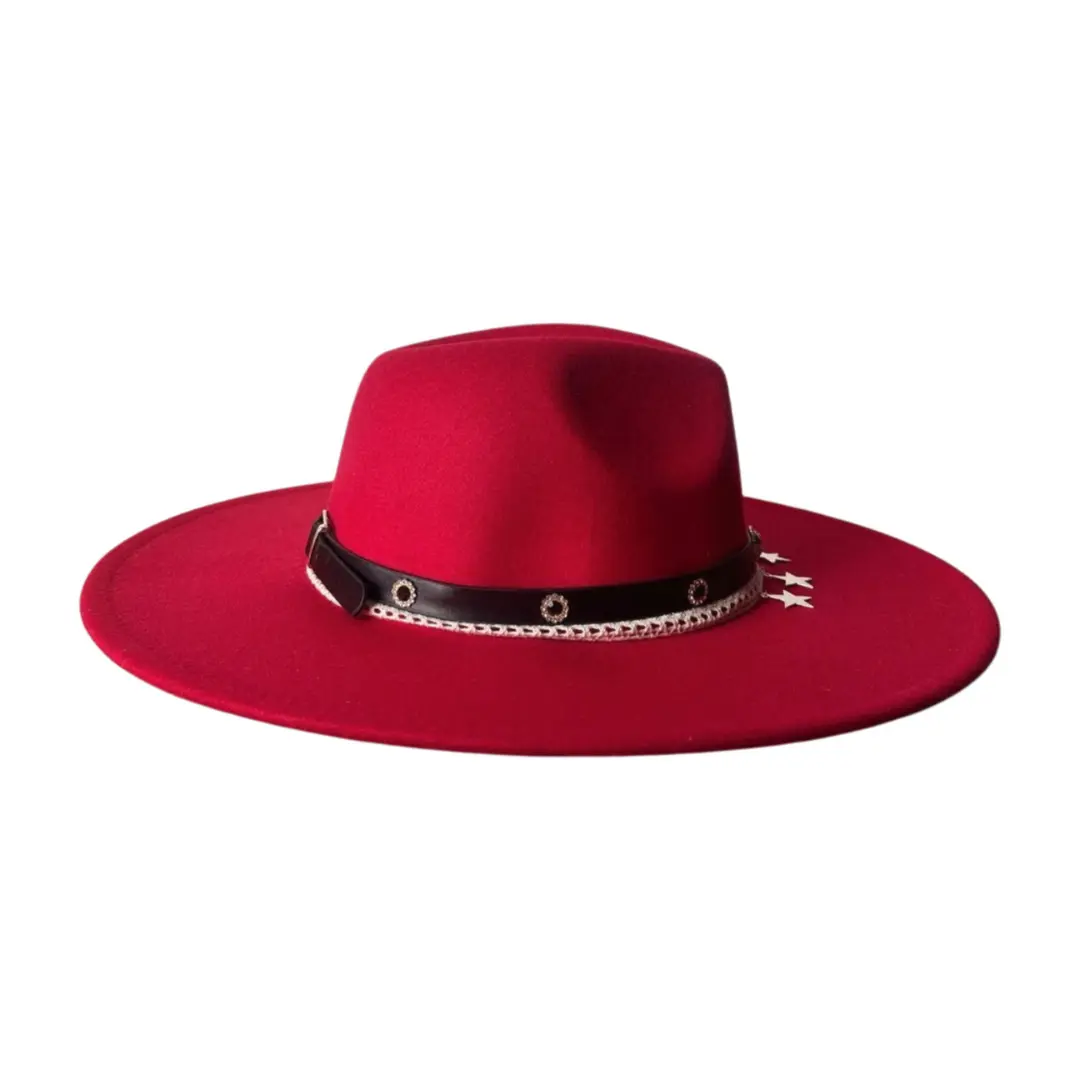 El sombrero Lorenza Red es una declaración de estilo y actitud. Su tono rojo intenso transmite fuerza y elegancia, mientras que la banda de cuero negro con detalles metálicos y estrellas plateadas le aporta un toque moderno y audaz.