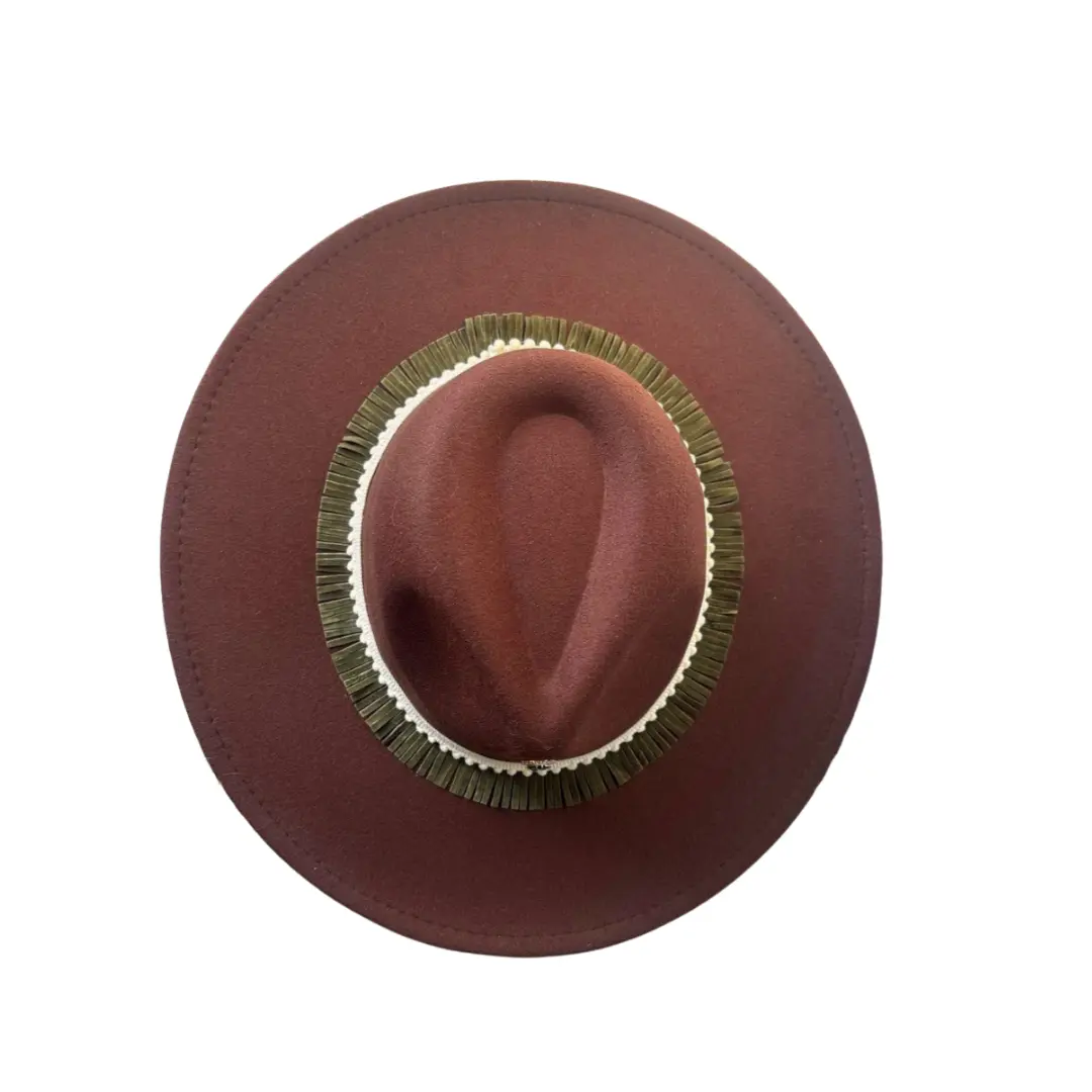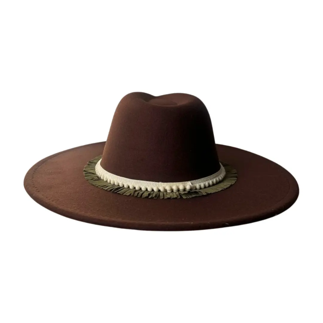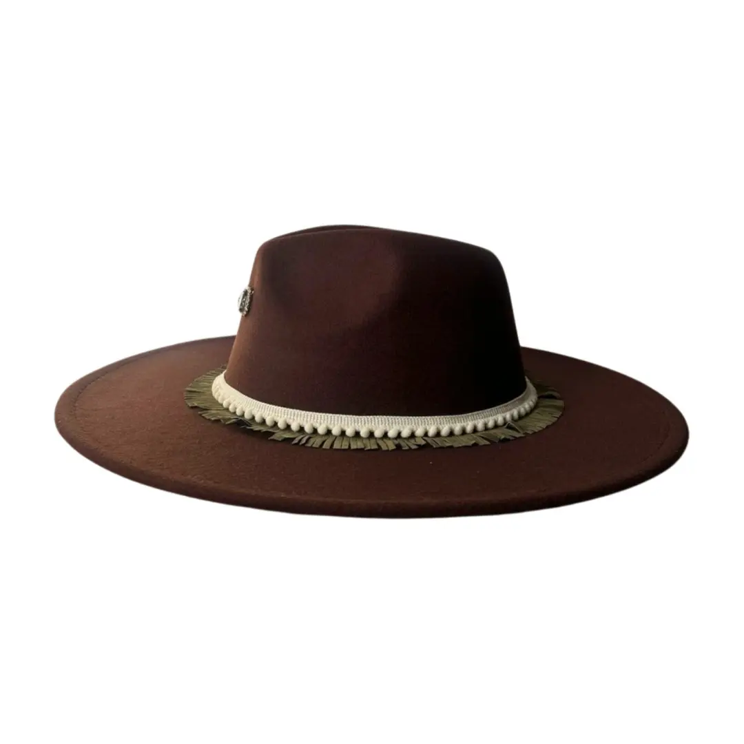 El sombrero Malva combina elegancia natural con un toque artesanal que lo hace único. Su tono marrón cálido evoca serenidad y estilo, mientras que la banda decorativa con flecos dorados y detalles en crema aporta un contraste sofisticado y distintivo.