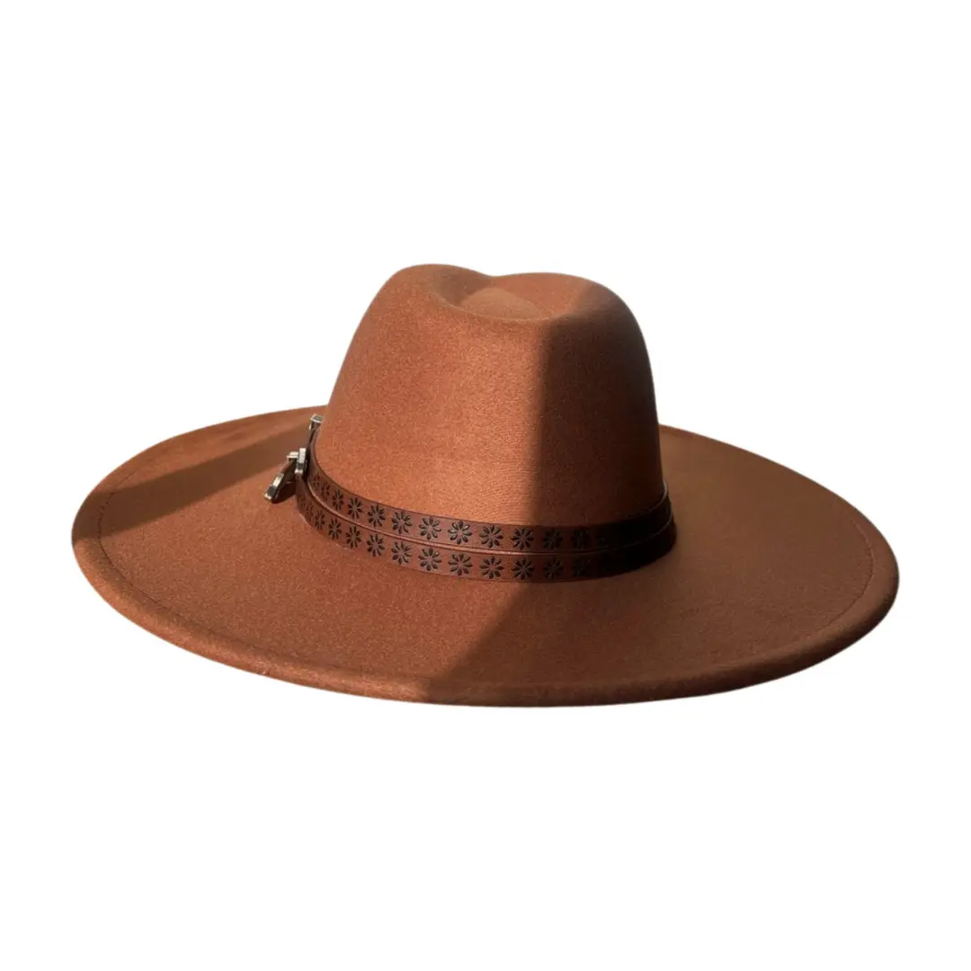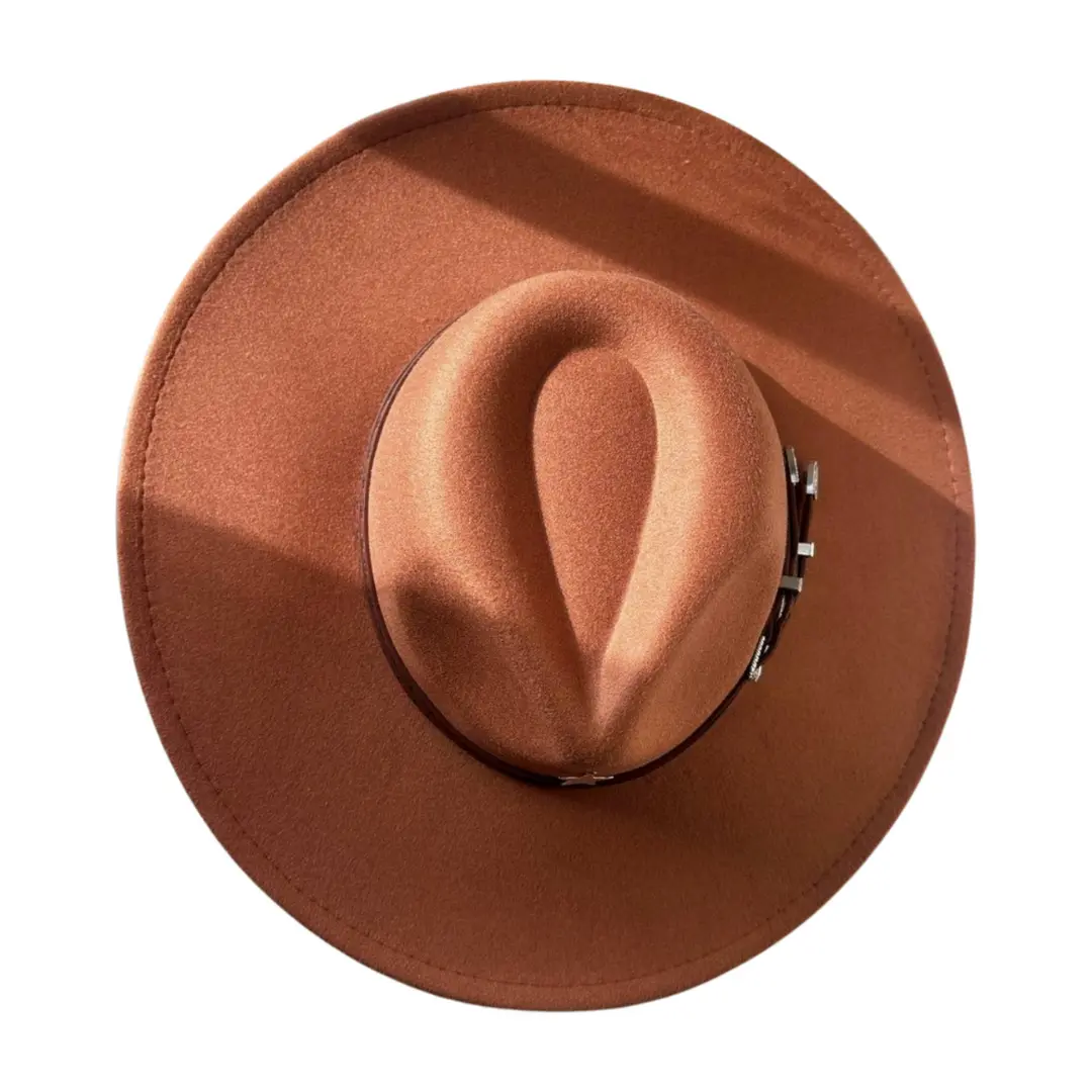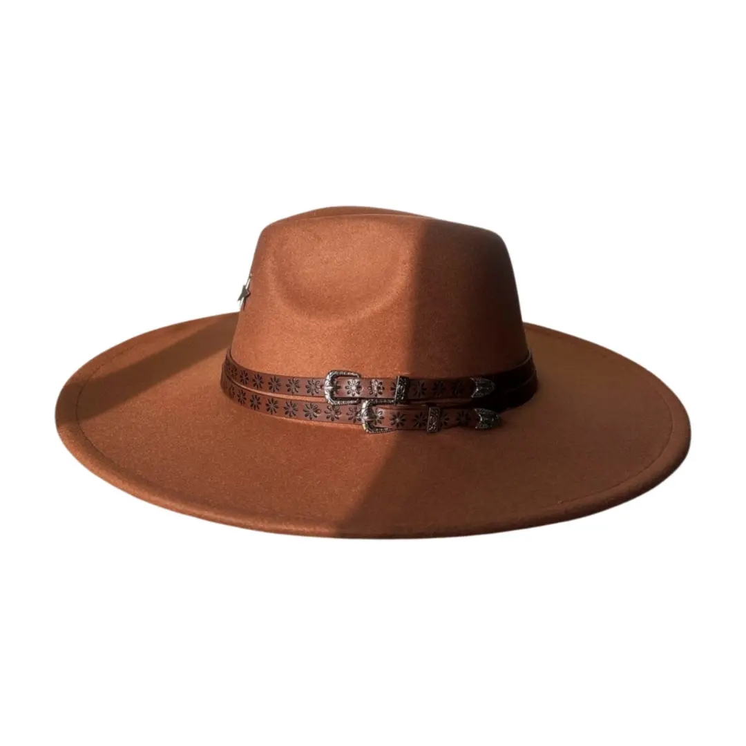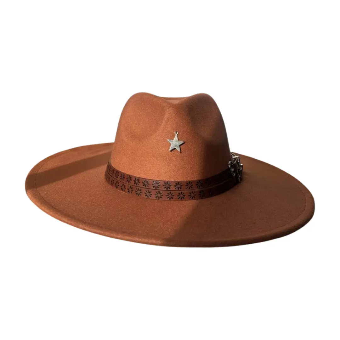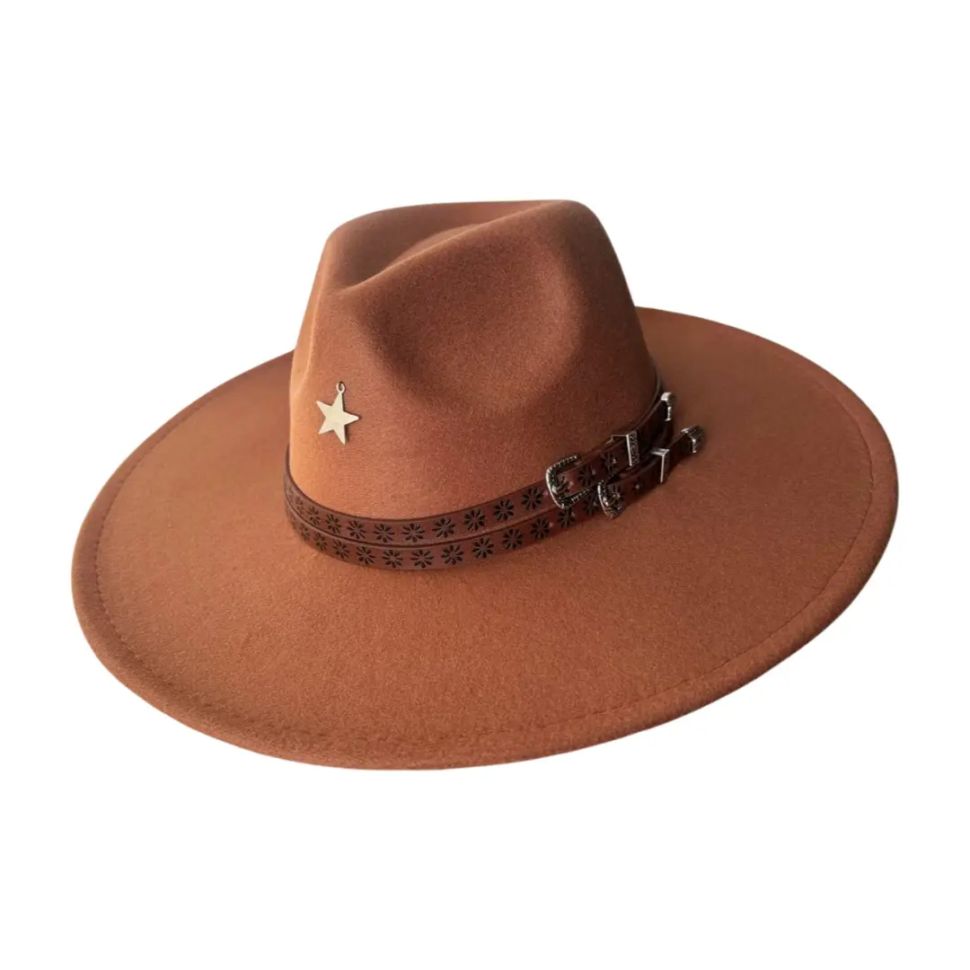 El sombrero Romina refleja fuerza, estilo y carácter. Su tono camel cálido se complementa con una banda doble en cuero grabado y hebillas metálicas, que aportan un aire western moderno. El detalle de estrella plateada simboliza libertad y confianza, convirtiéndolo en una pieza ideal para mujeres auténticas y seguras de sí mismas.